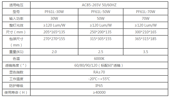 LED投光燈PF61L主要參數